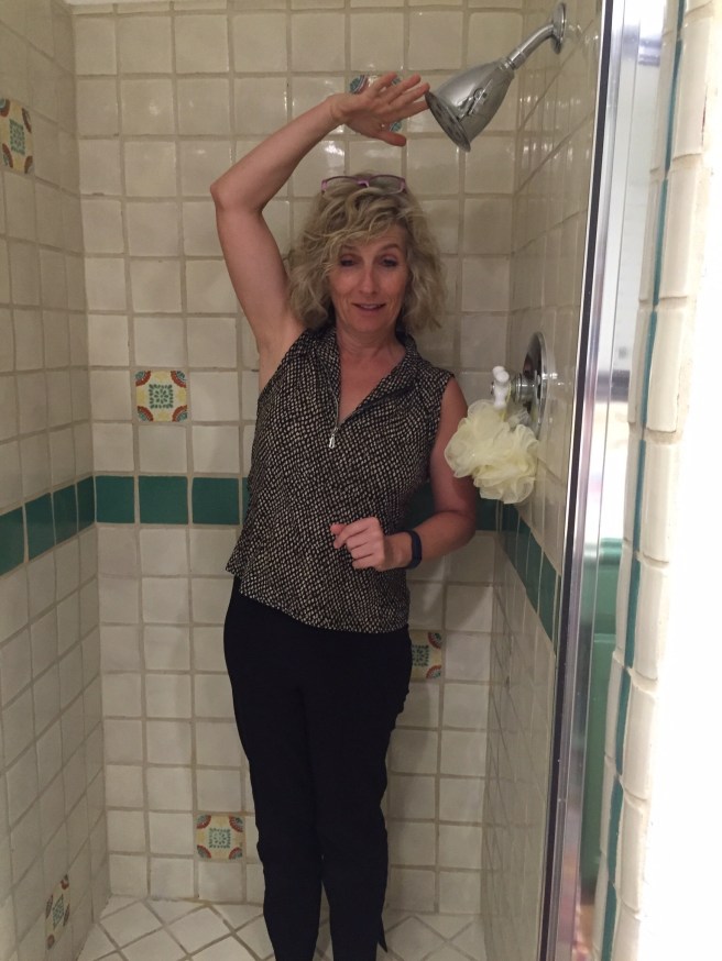Photo of shower, and for those of you who don’t know Cathy is 5′ tall.